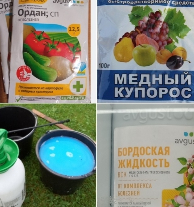 Для борьбы со спорами мы можем взять бордоскую жидкость классическую, не бутылочную, либо хом, абига пик. Для более поздней обработки, при температуре выше +10-15, можно брать для этого комбинированные средства - купролюкс, ордан, оксихом и другие