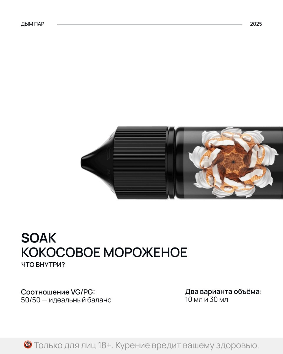 Что за вкус? Лето еще не скоро, но мы приблизим его с SOAK — «Кокосовое мороженое» Нежное, легкое и освежающее. Сливочный вкус лета, пляжа и тропиков. 🍭Сладость: 7/10 🍧Свежесть: 4/10 Яркий и насыщенный аромат баунти никого не оставит равнодушным! Хотели бы попробовать этот вкус? Пишите в комментариях! *Только для лиц 18+. Курение вредит вашему здоровью