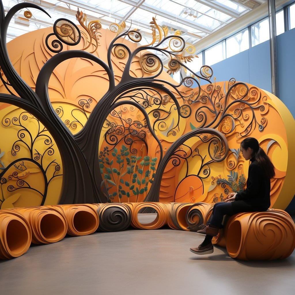 Создано на основе запроса: background tree of life Klimt, children's area, benches, green roofs, yarrow, calamus, solidago xcultorum, people, children, children's games