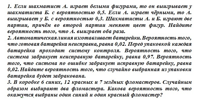 Разбираем решение задач №5 профильного ЕГЭ Задача №1 Выигрыш первой и второй партии являются независимыми событиями Напоминалка: независимые события-это события, которые не изменяют вероятность другого события. Вероятность того, что оба события произойдут, равна произведению вероятности каждого 0,5*0,3=0,15 Ответ: 0,15 Задача №2 Батарейка будет забракована в двух случаях: 1) Она неисправна И забракована Вероятность того, что батарейка несправна,равна 0,02. Вероятность того, что будет забракована неисправная батарейка, равна 0,97. значит, вероятность того, что батарейка неисправна И забракована, равна 0,02*0,97=0,0194 2) Она исправна И забракована Вероятность того, что батарейка исправна,равна 1- 0,02=0,98. Вероятность того, что будет забракована исправная батарейка, равна 0,02. значит, вероятность того, что батарейка исправна И забракована, равна 0,02*0,98=0,0196 Если в задаче просят найти вероятность того, произойдет одно событие ИЛИ другое, то мы складываем вероятности. Ориентируем