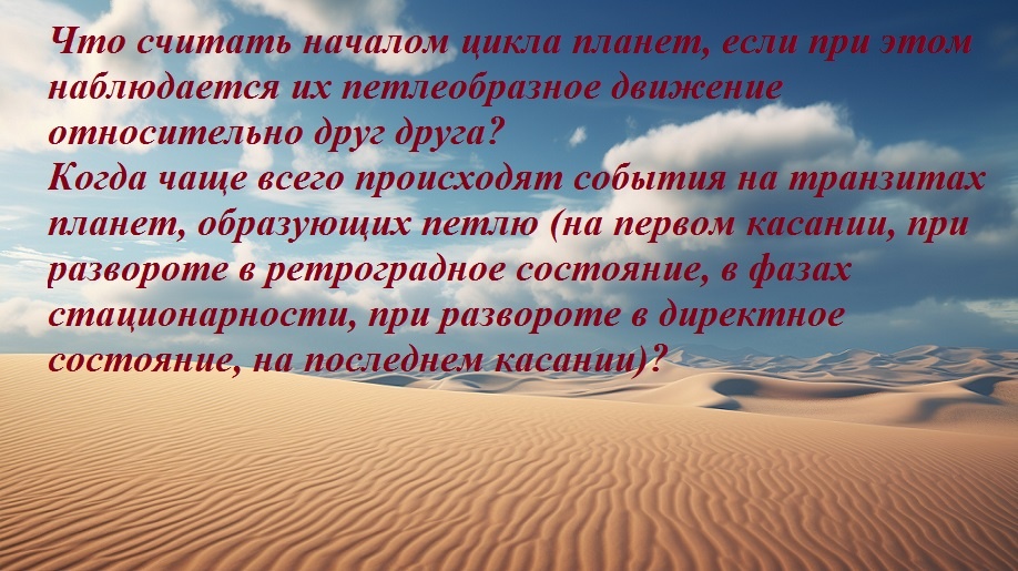 Что считать началом цикла планет, если при этом наблюдается их петлеобразное движение относительно друг друга? Когда чаще всего происходят события на транзитах планет, образующих петлю (на первом касании, при развороте в ретроградное состояние, в фазах стационарности, при развороте в директное состояние, на последнем касании)?