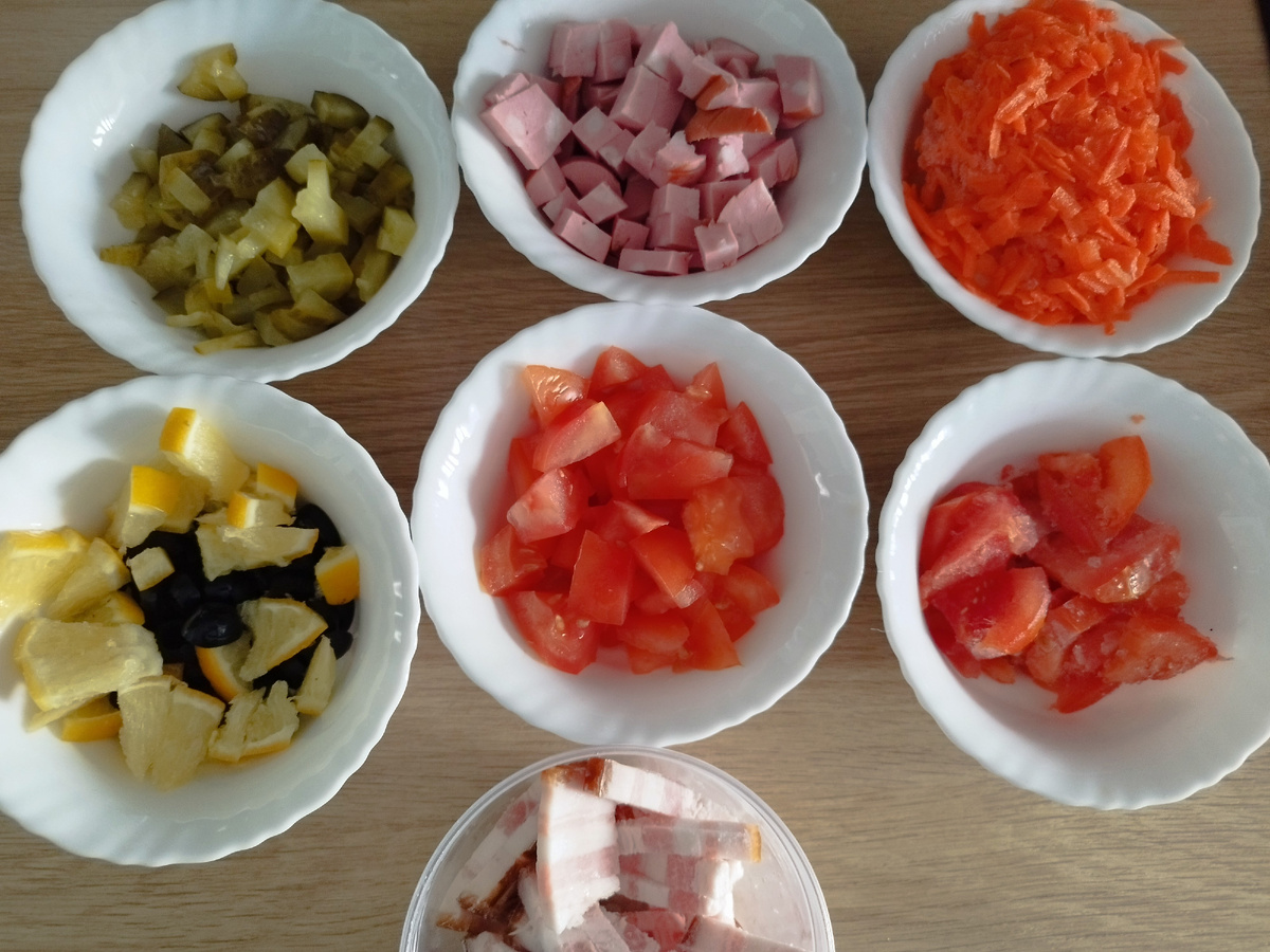 Говядину отварить для насыщенного бульона., разделать, обратно вернуть в кастрюлю, там же отварить картофель. Подготовить ингредиенты. Лук, морковь, перец, помидор Порезать кубиками или соломкой, кому как нравится. Лимон и маслины порезать и отставить в сторону. На сковороде обжарить все колбасные изделия, убрать в сторону. Отдельно обжарить овощи: лук, морковь, болгарский перец, помидор. соленые огурцы, чеснок. К овощам добавить тома