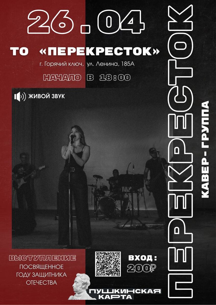 Друзья , отличная новость! 🤩 Приглашаем вас на вечер живой музыки! 🎤 Кавер-группа «Перекресток» исполнит военные и патриотические композиции, а также популярные хиты, которые согреют душу и поднимут дух. 🎶 Проведите этот вечер в компании друзей и близких, насладитесь атмосферой единства и патриотизма! 🇷🇺 📅 Дата: 26 апреля 🕕 Время: 18:00 📍 Место: ТО «Перекресток» Адрес: г. Горячий Ключ, ул. Ленина, 185А 💵 Вход: 200₽ или по Пушкинской карте Не пропустите! ✨