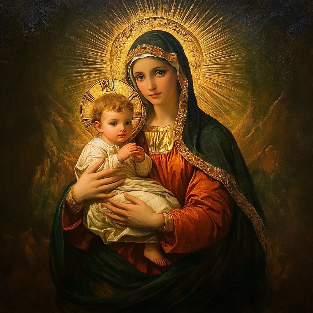 Создано на основе запроса: classical painting of mother Mary holding baby Jesus looking majestic and proud with aura behind her