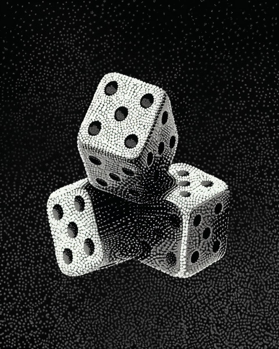 Создано на основе запроса: three dice, closely spaced 5mm apart, without outlines, soft edges, grainy texture on dice, subtle noise, monochrome, low contrast, floating in a solid black background with no noise, modern pointillism with small dots