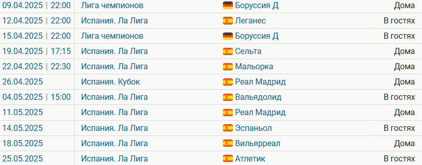 «Барселоне» осталось одержать шесть побед, чтобы гарантировать себе 28-й титул Ла Лиги. Команде Ханси Флика нужно выиграть четыре домашних матча — против «Сельты», «Мальорки», «Реала» и «Вильярреала». Также потребуется минимум две победы на выезде — в матчах с «Леганесом», «Вальядолидом», «Эспаньолом» и «Атлетиком». В случае, когда все зависит только от каталонцев, они могут стать чемпионами 14 мая. Но «Мадрид» может помочь ошибкой. Календарь «Барсы»: Положение могло быть еще лучше, если бы «Барса» не упустила победу в матче с «Бетисом» в субботу — тогда все закончилось ничьей 1:1. Тем не менее, с преимуществом в четыре очка и предстоящим домашним матчем против неубедительного в этом сезоне «Реала», трудно не видеть фаворита в борьбе за титул.