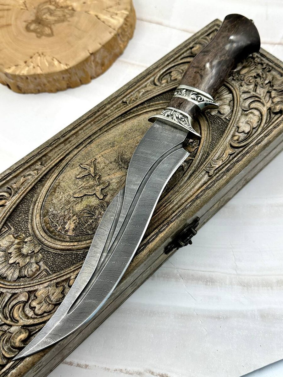 Нож «Эксклюзив» из дамасской стали в 950 слоев с фрезерованными долами (они же ребро жесткости). Рукоять выполнена из стабилизированной карельской березы коричневой и мельихора. Гарда травмобезопасная. Нож заточен в бритву. Твердость клинка (HRC): 62 Цена со скидкой пр 30 апреля 21318 рублей. Обычная цена 25080 руб. Арт: 10819-1 В комплекте идут ножны из натуральной кожи. Можем сделать формованные ножны +8000 рублей. Для заказа писать на @Nazarklinokbot или по тел +79101343831 WhatsApp