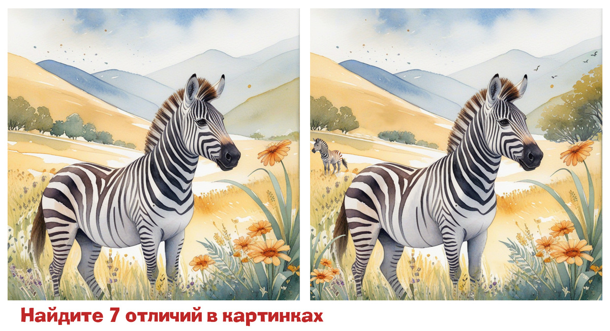 Как говорят путешественники: "Только внимательный глаз заметит, где саванна начинается, а где заканчивается." Зебра вышла на прогулку в саванне, чтобы полюбоваться цветами и холмами. Всё шло гладко, пока она не заметила, что что-то изменилось. То ли полоски на шкуре стали другими, то ли цветы перепутались местами? А может, холмы вдруг сменили очертания? Зебра в замешательстве, но ты можешь помочь ей разобраться. Найди 7 отличий и верни гармонию в этот уголок саванны! Горизонтальный тест найдите сходство и различие между картинками: Вертикальный тест найти различие между картинками: Какой глазомер! Ни одна деталь не ускользнула. Теперь зебра снова может наслаждаться прогулкой. Пусть вечер будет таким же уютным, как тёплый ветер саванны.