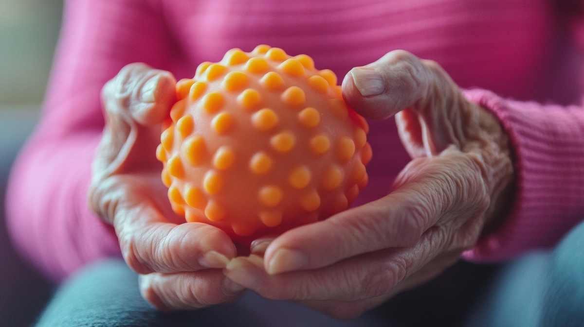 Создано на основе запроса: Close-up of a senior using a hand gripper or squeezing a stress ball for exercise