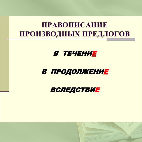 Производные предлоги образованы от других частей речи. Например, предлоги в течение (часа), в продолжение (лета), вследствие (засухи) происходят от существительных течение, продолжение, следствие и предлога в; предлоги благодаря и несмотря на – из деепричастий; предлоги вокруг (дома), согласно (приказу) – из наречий (ходит вокруг, живут согласно). 1. Пишутся слитно производные предлоги Выражение иметь в виду пишется в три слова. 2. Пишутся раздельно производные предлоги В предлогах в течение, в продолжение, вследствие на конце пишется Е: в течение урока, в продолжение занятий, вследствие болезни. У существительных течение, продолжение, следствие в предложном падеже пишется окончание И: в течениИ реки, в продолжениИ повести, в следствиИ по делу о хищении. Предлоги благодаря, согласно, вопреки, наперекор, навстречу употребляются с дательным падежом: согласно (чему?) графику, вопреки (чему?) предсказанию.