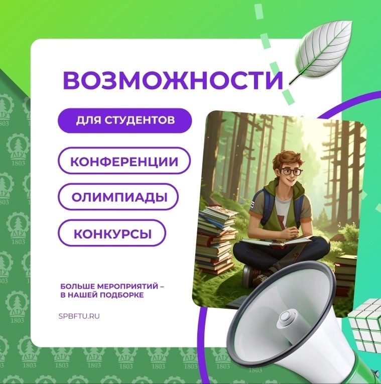 Дорогие студенты⚡️ Готовы ли вы покорить новые вершины и раскрыть свой потенциал? ✅ Участие в конкурсах, олимпиадах и научных конференциях – это не просто возможность продемонстрировать знания, но и шанс получить незабываемый опыт, завести полезные связи и стать лучшей версией себя! Мы собрали для вас подборку мероприятий, которые помогут вам достичь новых высот! 🚀 Конкурс научных проектов студентов в области биологии и лесного хозяйства в рамках X Всероссийской научно-технической конференции «Леса России: политика, промышленность, наука, образование» 🚀 Онлайн-курс «Профилактика идеологии неонацизма в детской и молодежной среде» 🚀 Конкурс креативного видеоконтента «Битва креаторов» 🚀 XXII сезон Всероссийского конкурса «Моя страна — моя Россия» 🚀 Смена «Заповедного дела РГО» в Архангельской области #СПбГЛТУ #ВОЗМОЖНОСТИ