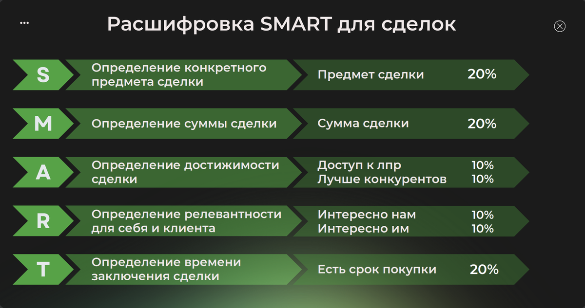 Внедрение новых систем оценки сделок часто встречает сопротивление сотрудников. Однако подход SMART-сделок, который уже успешно работает в более чем 40 компаниях разных стран, можно внедрить органично — через игровые механики и четкие выгоды для команды. Это система оценки вероятности закрытия сделки по объективным критериям, где каждой стадии воронки соответствует определенный процент завершенности. Например: Преимущества: 1. Превратите процесс в квест Вместо приказов — создайте соревнование с призами за: Пример: