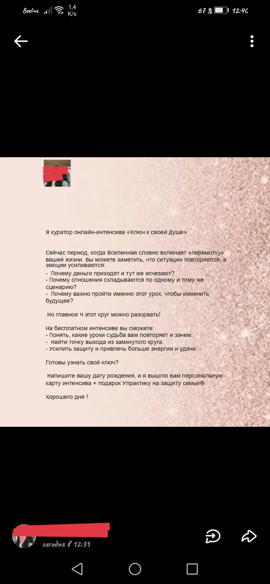 Вообще-то сегодня хотела писать совсем о другом, но просто не смогла пройти мимо такого шикарного экземпляра, которая все утро лайкала посты и кидала заявки в друзья. Не ответить на заявку было просто невозможно. Довольно часто я отвечаю на заявки, все еще сохраняя крупицы оптимизма и веры в людей. Но все чаще это горы спама, какие-то неадекваты, "пришли нюдсы" "лови дикпик". Был даже сталкер, который преследовал меня целых два года. А так хочется верить, что где-то есть умные и интересные люди, с которыми есть о чем поговорить, у которых можно многому научиться и узнать что-то новое для себя. Но нет, не в этот раз. Почти сразу после ответа на заявку прилетела Вот это: Бесплатные интенсив. Бес платит за интенсив, еще и дарит практику на защиту семьи. Как мы все знаем, бесплатный сыр бывает только в мышеловке. И каждый раз, сталкиваясь с подобными завлекалками, удивляюсь - неужели кто-то в это ещё верит? Вот вышли сейчас дату рождения - придет ответ и какие-нибудь дополнительные матер