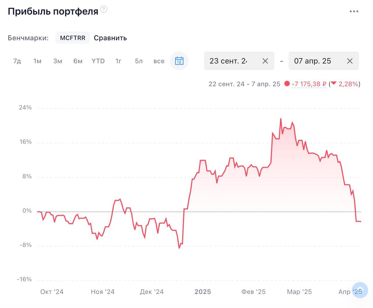Рынок падает после перформанса Трампа с пошлинами. Новички в чате паникуют (если вы зайдете в комментарии к любому посту в канале — окажетесь в привязанном к каналу общем бесплатном чате). Долгосрочные инвесторы типа меня радуются распродаже. Ведь можно купить новые акции по вкусненьким ценам. В этом и плюс долгосрочной дивидендной стратегии, мы радуемся при любом раскладе. Упало — можно докупить дешевле. Выросло — приятно, капитал растет. На картинке видно, большое ли сейчас падение для моего портфеля. В декабре 24 было и побольше. Я — неукоснительный Сорокин и продолжаю делать закупки. Добавил сегодня восемь тысяч рублей. Тем более, челлендж не дает расслабиться. Купил: — 10 акций Сбер пр по 282 (дивдохдность снова больше 10% уже после уплаты налогов, нравится!); — 20 акций Газпрома по 124 (не могу пройти мимо, верю в его долгосрочное будущее, хоть в моменте нет дивидендов); — и 5 акций Газпромнефти по 535, манит прогнозная дивдоходность в 13% к текущей цене (уже после налогов). Прог