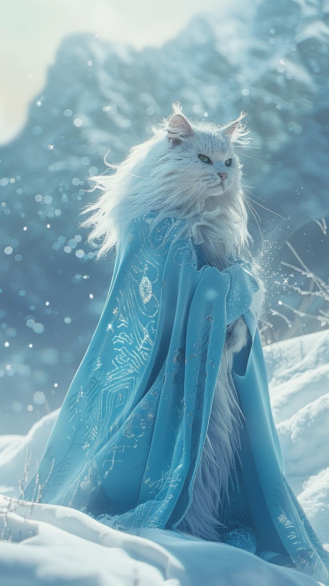 Создано на основе запроса: A beautiful white-furred bipedal cat standing in fresh snow, wearing icy blue robes