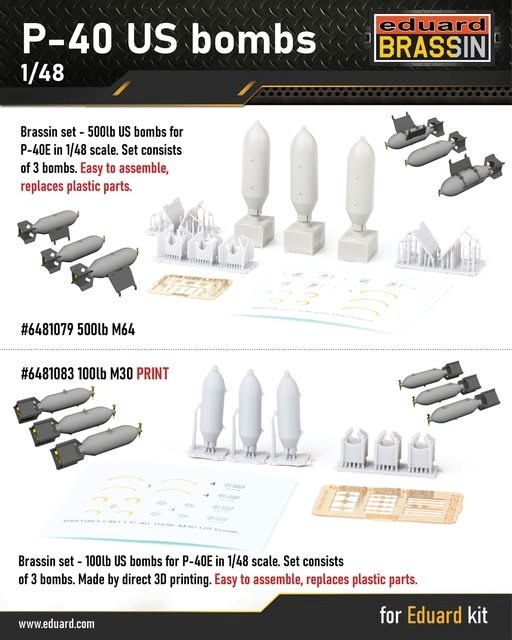 Чешская Eduard выпускает на 3D-принтере в серии Brassin американские бомбы для своей модели P-40 в масштабе 1/48: P-40 500lb M64 US bombs (каталожный номер 6481079)