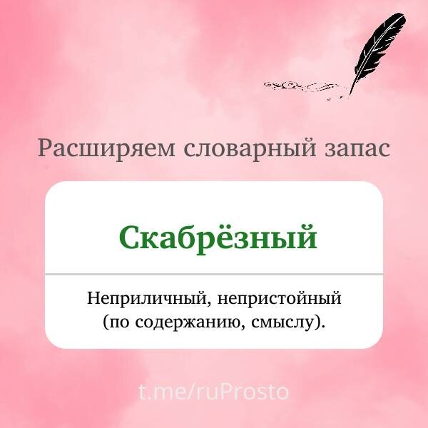 📂 Словарный запас Скабрёзный — неприличный, непристойный (по содержанию, смыслу). Скабрезность — это черта характера человека, которая выражается в склонности физиологично, цинично и извращенно воспринимать мир, глумясь над интимным и сокровенным. По своей сути это черта — родная сестра пошлости. Скабрезность смеется над тем, что человеку дорого, и выставляет на всеобщее обозрение то, что для него сокровенно и интимно. Она глумится над тем, что ему свято. #Словарный_запас