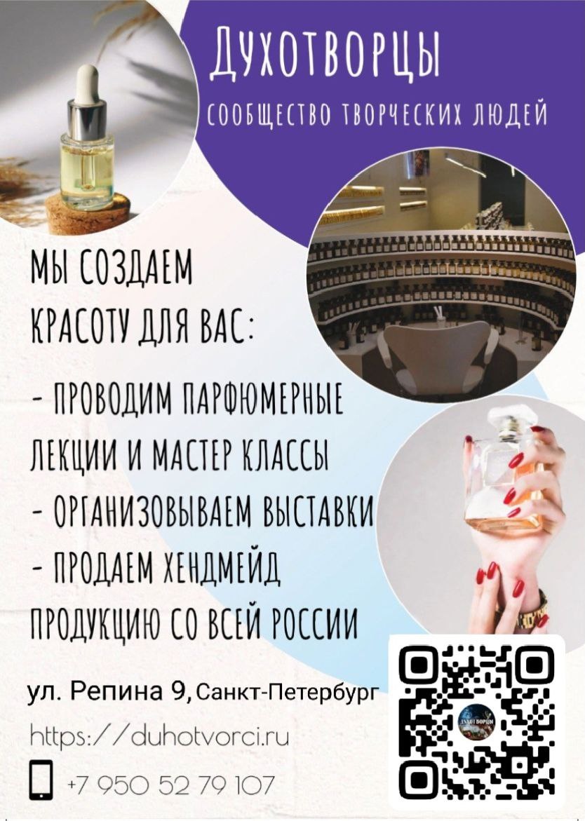 📢Пост для тех, у кого есть нос! Приходите к нам в пространство Духотворцы за новыми эмоциями, за вдохновением и незабываемым олфакторным воспоминанием!🌷 https://vk.com/duhotvorci На полках нашего пространства вы найдете авторские ароматы российских парфюмеров, работы хендмейд мастеров, свечи, мыло и много прочего крафта! Все сделано с душой и любовью 💜 👉У нас также проводятся мастер классы по парфюмерии, диффузорам, мылу и свечам. 👉Раз в неделю проводятся парфюмерные лекции для всех желающих, дабы прикоснуться к миру ароматов. 😉Пишите в сообщения группы для записи и посещения студии. ➡️Мы находимся на ул. Репина 9, Санкт-Петербург⬅️ #духотворцы #аромат #духи #парфюмерия #спб