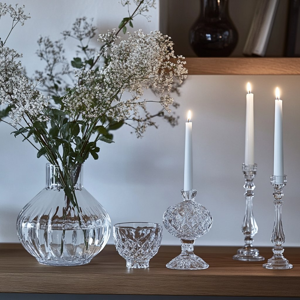 Скандинавский стиль, ценящий простоту и функциональность, позволяет использовать хрусталь дозированно, добавляя легкие акценты в виде небольших хрустальных подсвечников на деревянной полке или хрустальной вазы с полевыми цветами на деревянном столе.