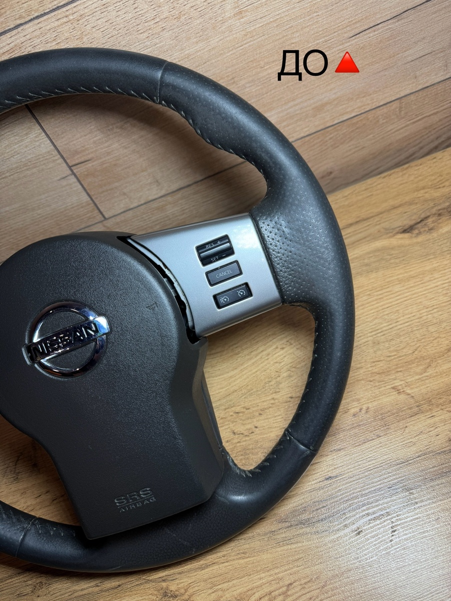 Перетяжка руля и ручки КПП Nissan Pathfinder в экокожу цвета антрацит. На ваше усмотрение можем добавить нулевую метку, яркую нитку, вставки из алькантары, псевдоперфорации, перетянуть подушку, сделать утолщение, покрасить пластик, восстановить оригинальный материал и даже установить подогрев.