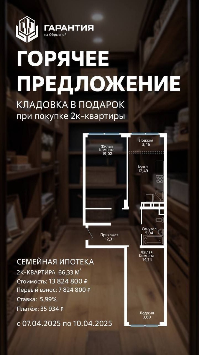 При покупке двухкомнатной квартиры в ЖК «Гарантия на Обрывной» (Краснодар) до 10 апреля – кладовка в подарок.