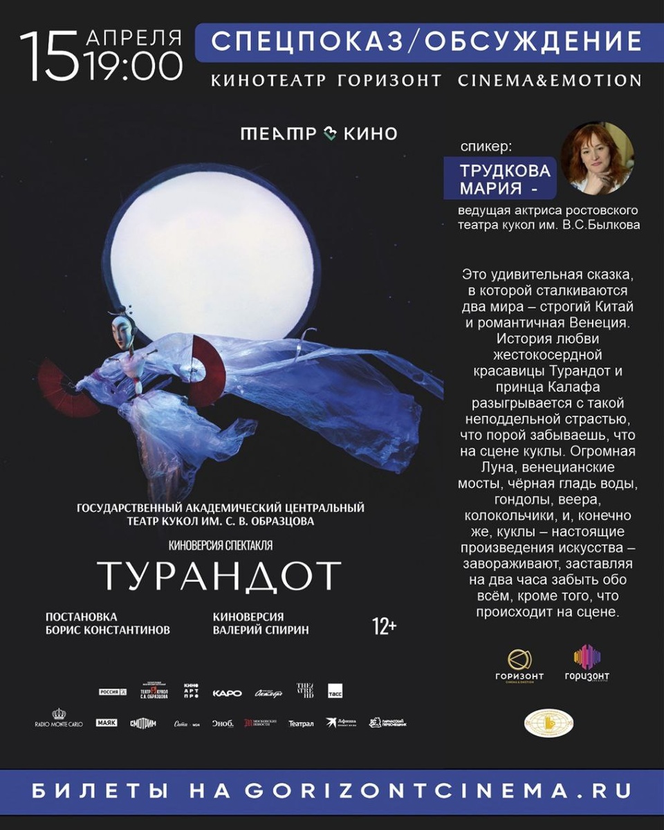 15 апреля в 19:00 в кинотеатре Горизонт CINEMA&EMOTION специальный показ киноверсии спектакля "Турандот". 🎤 Спектакль представит и обсудит со зрителями специальный гость показа: ведущая актриса Ростовского государственного театра кукол Мария Трудкова. Мария Сергеевна поделится уникальными фактами об истории создания этой постановки, а также биографией этого спектакля. 🎫 Билеты: https://gorizontcinema.ru/release/10055535?date=2025-03-27 #яместный