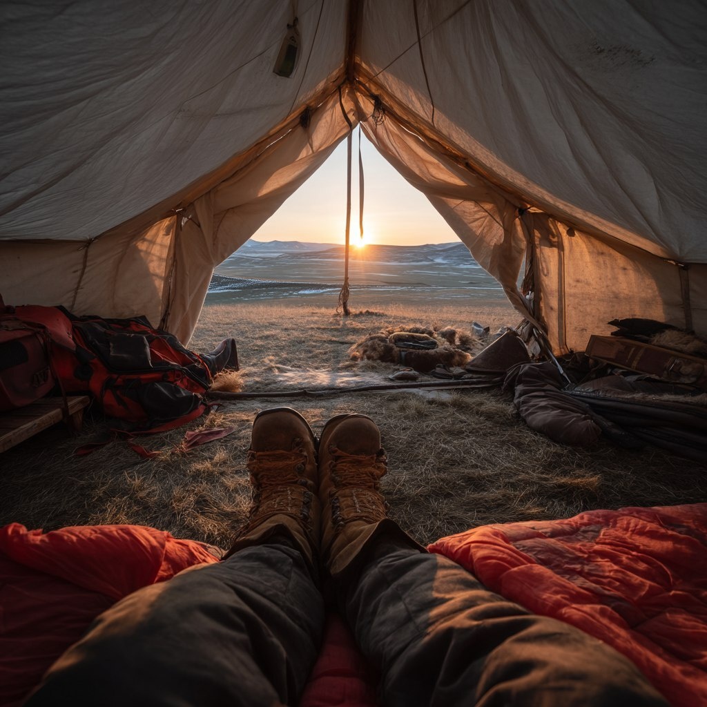 Создано на основе запроса: POV from Djingis Khan waking up in a mongolian tent on the steppes