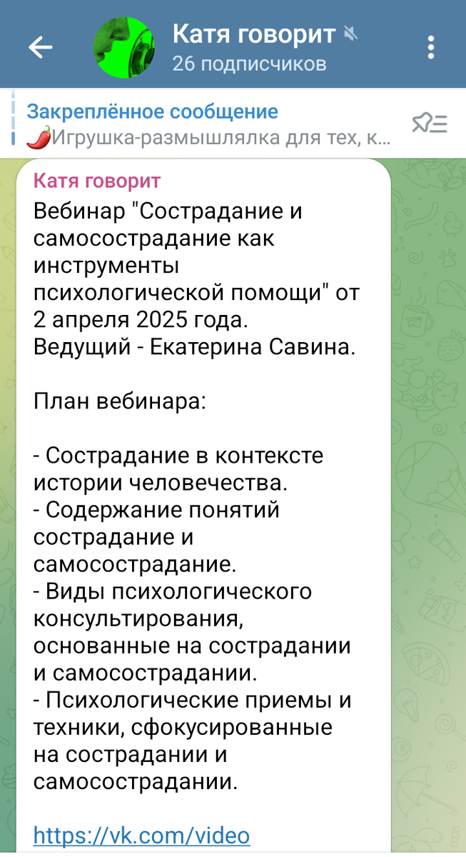 Здравствуйте, уважаемые читатели. Сегодня мы хотим вам показать пост одного слушателя наших лекций. Это психолог Екатерина Савина. Она слушала лекции и создавала своё. Мы очень рады, что ей пригодились. В ответ рекламируем её на нашем канале в Дзене. *** "Вебинар "Сострадание и самосострадание как инструменты психологической помощи" от 2 апреля 2025 года. Ведущий - Екатерина Савина. План вебинара: - Сострадание в контексте истории человечества. - Содержание понятий сострадание и самосострадание. - Виды психологического консультирования, основанные на сострадании и самосострадании. - Психологические приемы и техники, сфокусированные на сострадании и самосострадании. Финал последних почти двух лет работы в этом вебинаре. Видео не идеально сделалось, в некоторых местах звук и видеоряд немного не совпадают. Но это лучшее, что есть на сегодня. Совершенствовать сильнее и менять уже что-либо ресурса нет". У нас есть много полезных и интересных публикаций. Наш клуб 800Million