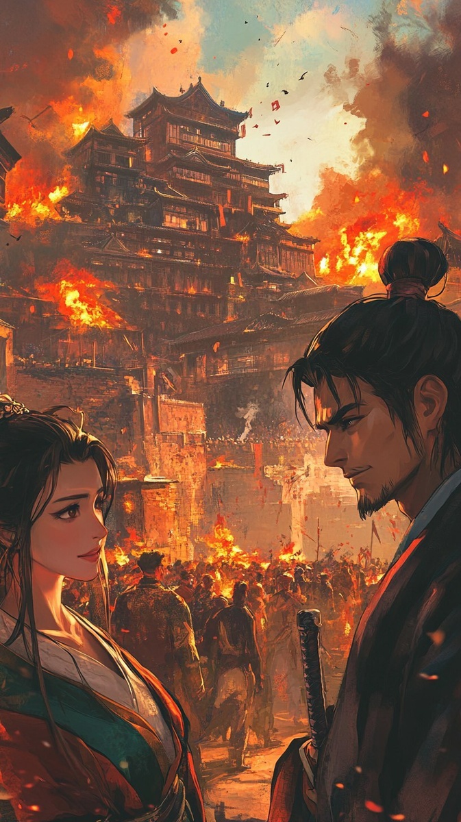 Создано на основе запроса: Anime style vertical illustration showing a dramatic contrast: in the background, a kingdom crumbling in chaos