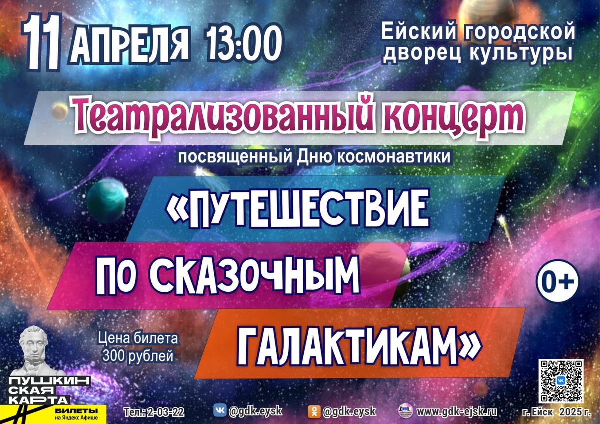 11 апреля 13:00 Театрализованный концерт, посвящённый Дню космонавтики «Путешествие по сказочным галактикам». Билеты можно приобрести в кассе по адресу: ул. Свердлова, 73/1, а также онлайн Цена: 300₽ Программа готовит для зрителей много интересного и увлекательного: флэшмобы, интерактивы и выступление детских творческих коллективов художественной самодеятельности Ейского городского дворца культуры имени А.А. Колесникова – победителей и призеров многих всероссийских конкурсов.