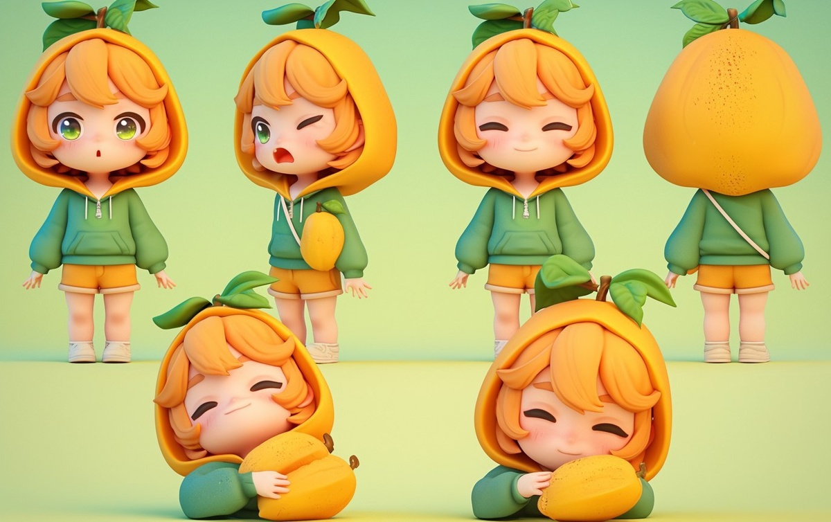 Создано на основе запроса: With a variety of different poses and expressions,chibi style, 3-head ratio, Clay style, A cute mango doll, With