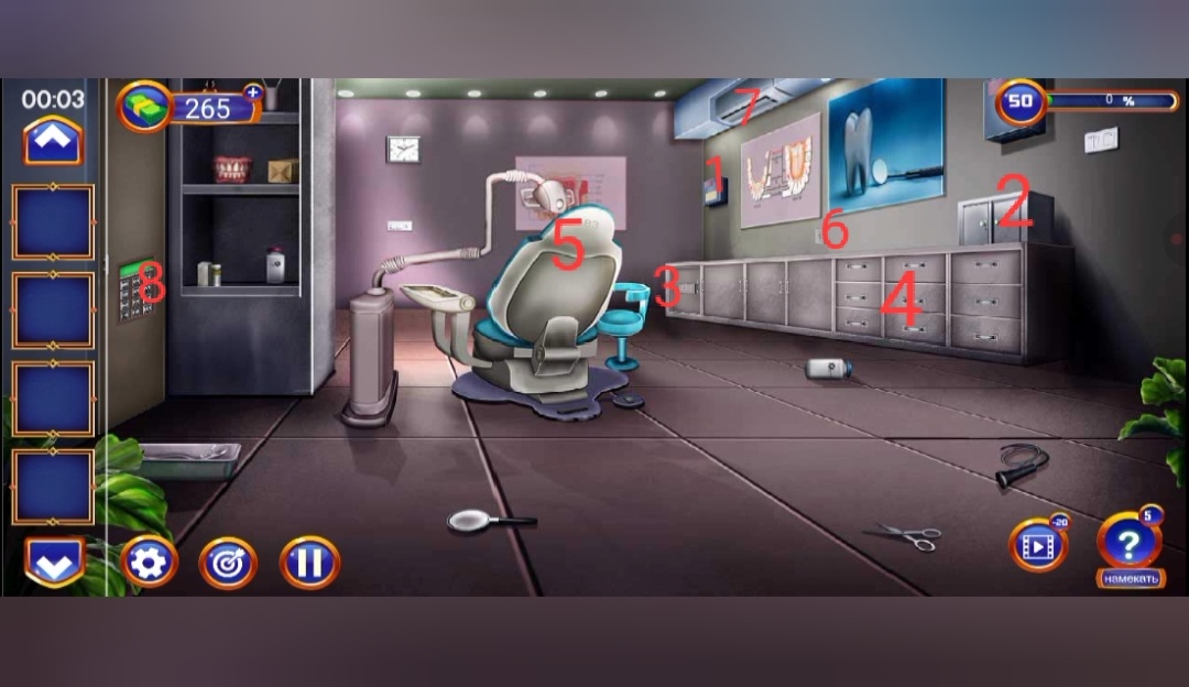 Привет, друзья! Добро пожаловать в зону мобильных игр. ✨ Интересные загадки были в последнем уровне игры и, самое главное, что решались без подсказок!!! Закончилась серия загадок, посмотрим, что будет дальше. Игр огромное множество, есть из чего выбирать. Начинаем уровень в кабинете врача. В первую очередь жмём на шкафчик в правом дальнем углу, там будет головоломка. Принцип прост: Нажимаем шарик (фишку), который в левом верхнем углу и передвигаем его, собирая ключи (я собрал все, наверное так надо, но можете попробовать взять лишь один). Внизу несколько разноцветных кнопок, которые меняют положение цветных стенок, их используем, чтобы открыть нашему шарику проход. Собрав все ключи ведём фишку к двери в правом нижнем углу. Открывается шкафчик, и мы забираем файл и ключ. Данный ключ открывает серый шкафчик (2), в котором находятся батарейки. После этого открываем файл, забираем из него чек и находим код: 9873. Его мы вводим в соответствующем порядке на ящике стола (3) и получа