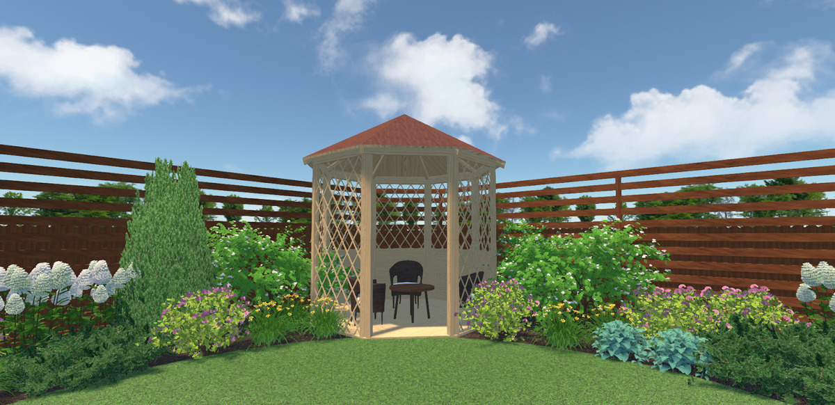 Хотите, чтобы миксбордер из многолетников радовал глаз весь сезон, был объемным и пышным? Главное правило — комбинируйте виды с разной высотой и сроком цветения. Мы подготовили несколько схем клумб для вдохновения. Нарисовали примеры в программе Ландшафтный Дизайн 3D. В каталоге ПО есть много растений. Любое можно отредактировать под себя: настроить размер, цвет листьев или лепестков. Так получится максимально реалистичный результат. Рядом с беседкой спланировали неприхотливую композицию. Фоном выступают вечнозеленые хвойные — почвопокровный можжевельник горизонтальный и стройный можжевельник скальный. Между ними — пышная гортензия метельчатая Limelight, цветущая с середины лета и до осени. Ароматный чубушник добавляет объема в начале сезона. В нижнем ярусе — хосты, лилейники и спирея японская. Все растения неприхотливы, хорошо зимуют и сохраняют декоративность весь сезон. Низкорослый вереск образует цветущий ковер в конце лета и осенью. А карликовые хвойные придают посадке структуру и