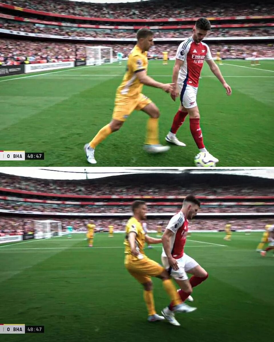 В самом начале второй половины буквально у углового флажка соперника Райс сфолил на Велтмане. Последний сразу же после свистка бросился разыгрывать, он пробросил руками мяч чуть вперед, но попал невзначай в ногу уходящему Деклану. Игрок «Арсенала» носком бутсы осознанно откинул этот мяч дальше, а Велтман, пытаясь произвести вынос вместо мяча ударил по ногам Райса.