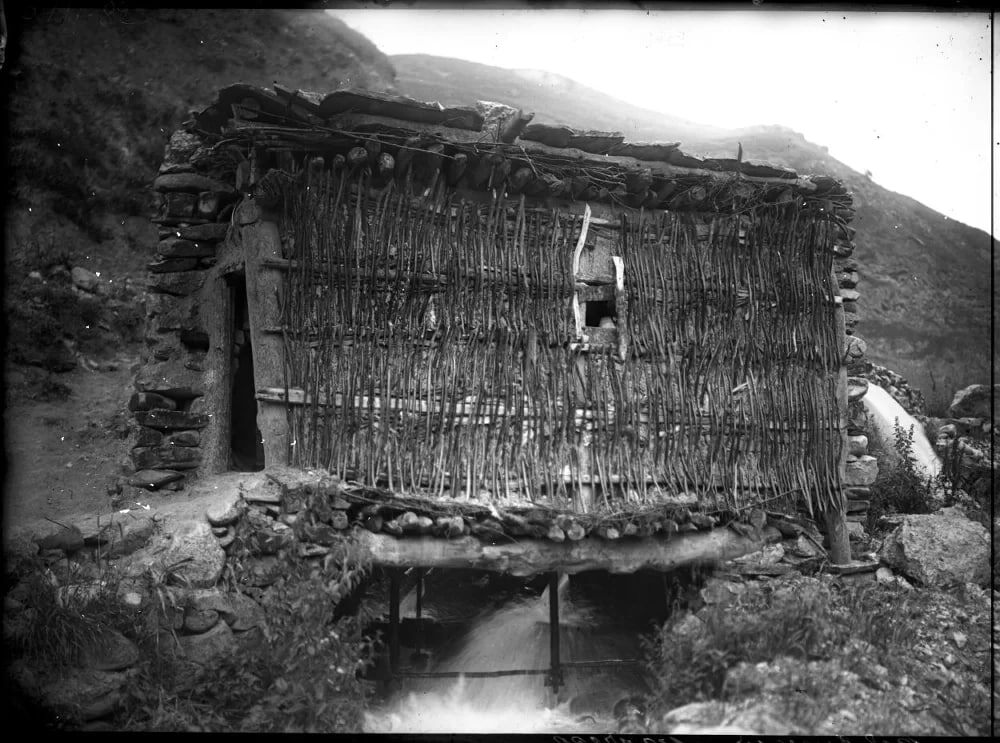 Водяная мельница в селении Кобан (1926–1931) «Три стенки сложены из камня, а одна плетеная, обмазанная глиной. Внизу под мельницей виднеется колесо» (из описания в коллекционной описи). Фотографы: Гречкин А.А., Сегеркранц В.В.
