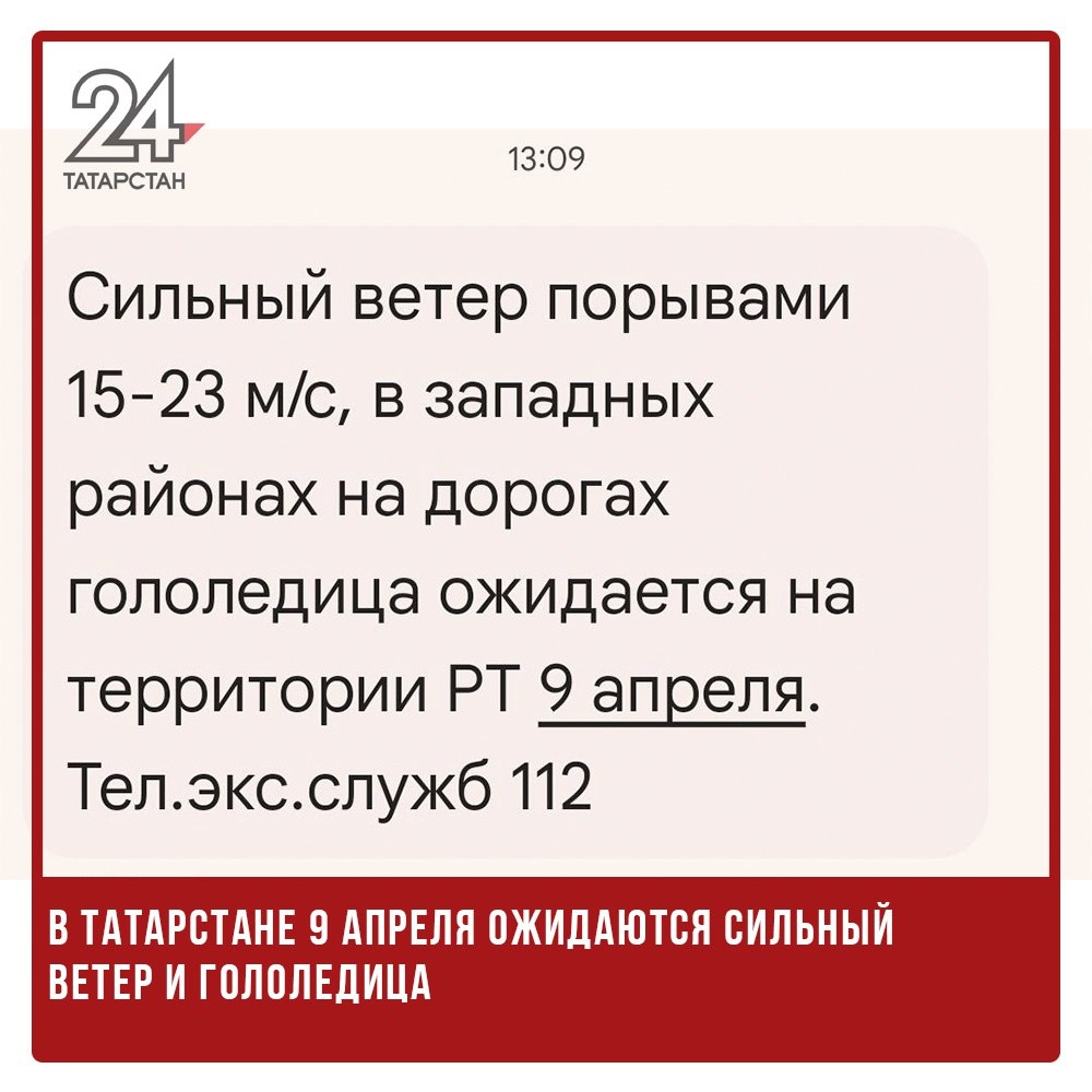 💨🧊В Татарстане 9 апреля ожидаются сильный ветер и гололедица Как сообщает МЧС России по Татарстану, завтра на территории республики ожидается сильный ветер порывами до 23 м/с. Также в западных районах Татарстана на дорогах возможна гололедица. Будьте осторожны! Подписаться на Татарстан-24 Отправить новость