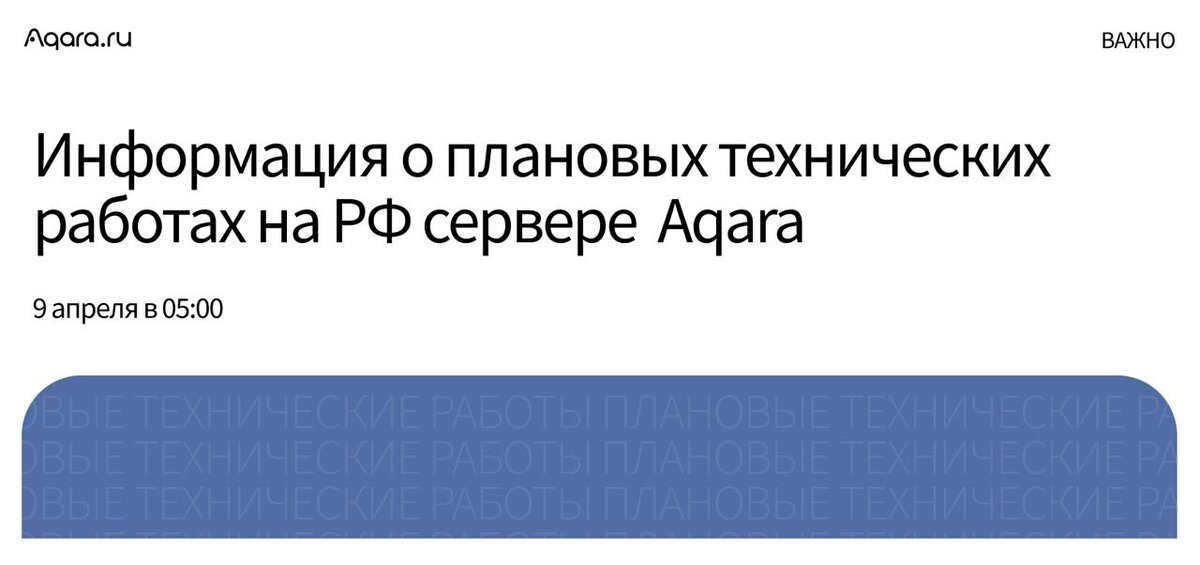 Уважаемые пользователи Aqara! Информируем о плановых технических работах на РФ сервере Aqara. 🔸Дата и время проведения: 9 апреля 2025 в 05:00 по московскому времени. 🔸Продолжительность: около 30 минут. Во время обновления возможны кратковременные перебои в работе: 1. Ограниченный доступ к приложению Aqara Home. 2. Возможные сбои в выполнении облачных автоматизаций (локальные автоматизации продолжат работу в штатном режиме) 3. Добавление новых / удаление старых устройств будет недоступно. ❕Пожалуйста, при появлении описанных ситуаций не сбрасывайте устройства и не предпринимайте дополнительных действий — все функции восстановятся автоматически после завершения обновления. Что изменится после обновления: • Повышение стабильности работы системы. • Добавление поддержки новых устройств. • Реализация новых функций. • Исправление выявленных ошибок. ❤️🔥 Приносим извинения за возможные неудобства. Благодарим за понимание и поддержку! С наилучшими пожеланиями, команда Aqara.ru #SmartN