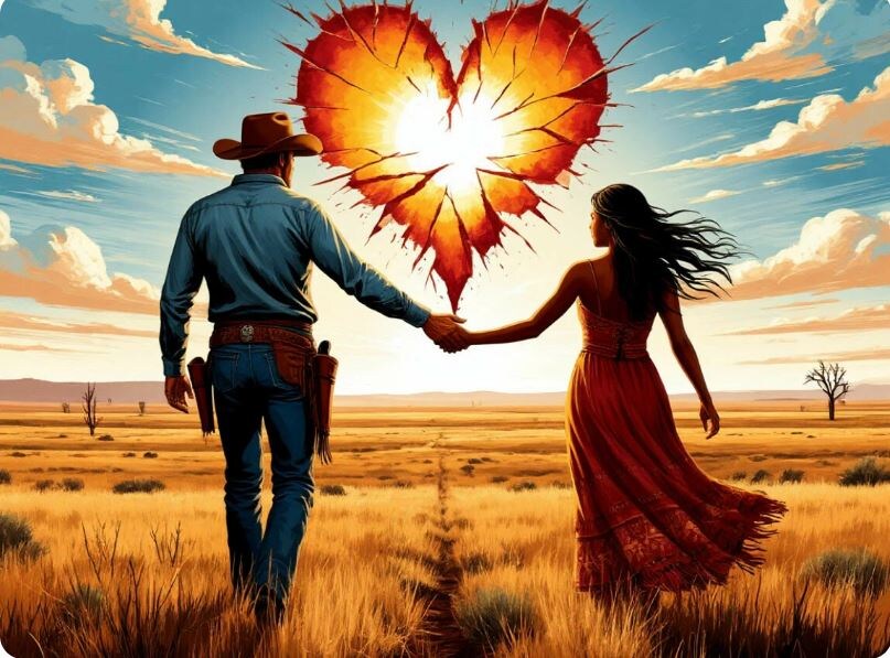 Сердце его сжималось от страха и вины, словно тиски из кованого железа. Думал ли он когда-нибудь, что жизнь забросит его так далеко от родных прерий, на край света, где земля дышит жаром, а воздух густ от тайн? Он был всего лишь простым ковбоем, сыном фермера, привыкшим к размеренному ритму жизни: уход за скотом, бесконечные просторы неба и запах сена. А теперь его бросили в водоворот войны, отправили на границу, где сталкивались миры – мир белых поселенцев и мир коренных жителей, мир, который он не понимал, но которому был вынужден противостоять. И вот она, судьба, подбросила ему испытание, от которого замирало сердце. Вражеский лагерь, огонь костров, крики воинов… И в этом хаосе – она. Дочь вождя, с глазами цвета летнего неба и душой, полной печали. Её красота поразила его, как молния, пронзившая тьму. Он забыл о войне, о вражде, видел только её. Они встречались тайно, под покровом ночи, в тишине, нарушаемой лишь шелестом листьев и кр