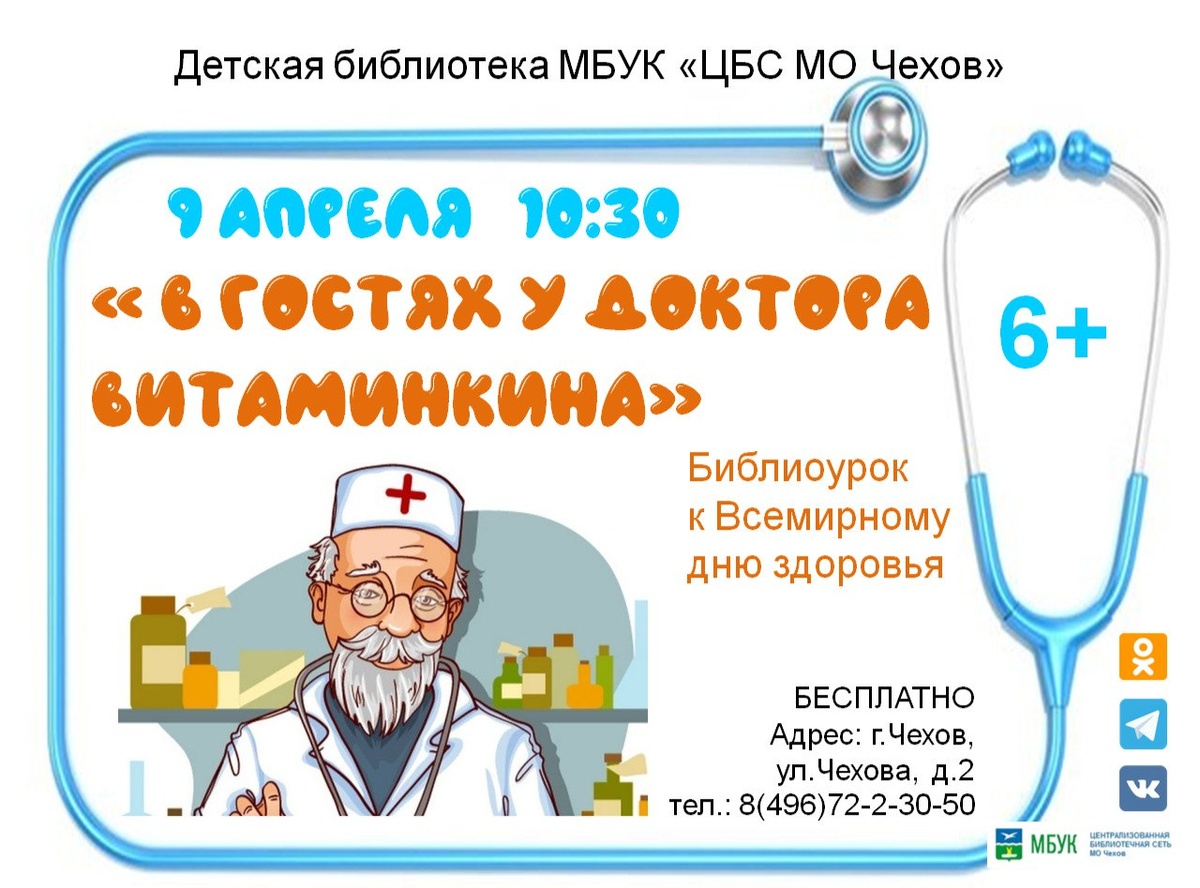 ✨ День здоровья в библиотеке 🏃Ребята вспомнят основные правила здорового образа жизни, 💊познакомятся с понятием «витамины», 🍔примут участие в интересной игре "Полезные и вредные продукты питания". 🚫 Возраст: 6+ 📆 09.04.2025 🕛 10:30 🏢 Детская библиотека 📍 г. Чехов, ул. Чехова, д.2 🪙 Вход свободный❗️ #webЧехов ✅ Мероприятия Чехов https://dzen.ru/id/66cc4b48e9ef144699238a51 http://vk.com/chekhov_events http://dzen.ru/chekhov_events