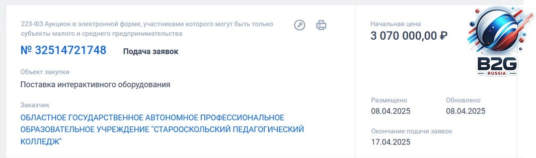 💼 Объявлен тендер в Белгородской области на Поставку интерактивного оборудования