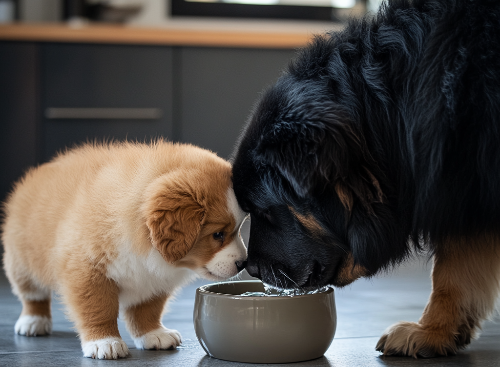 Щенок первые дни буквально ходит за старшей собакой по пятам и повторяет за ней все — от способа пить воду до маршрута по дому.