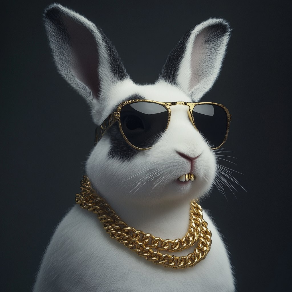 Создано на основе запроса: white female rabbit with black markings and upright ears. The rabbit is missing a tooth and looks like a proper gangster, with sunglasses and gold chains --- Автоперевод: Белая самка кролика с черной маркировкой и вертикальными ушами. Как тебе такая генерация? 🤔 https://dzen.ru/id/65c0c65c86e4f837c27b24d7 #ИИ #AI #нейросеть #midjourney #art