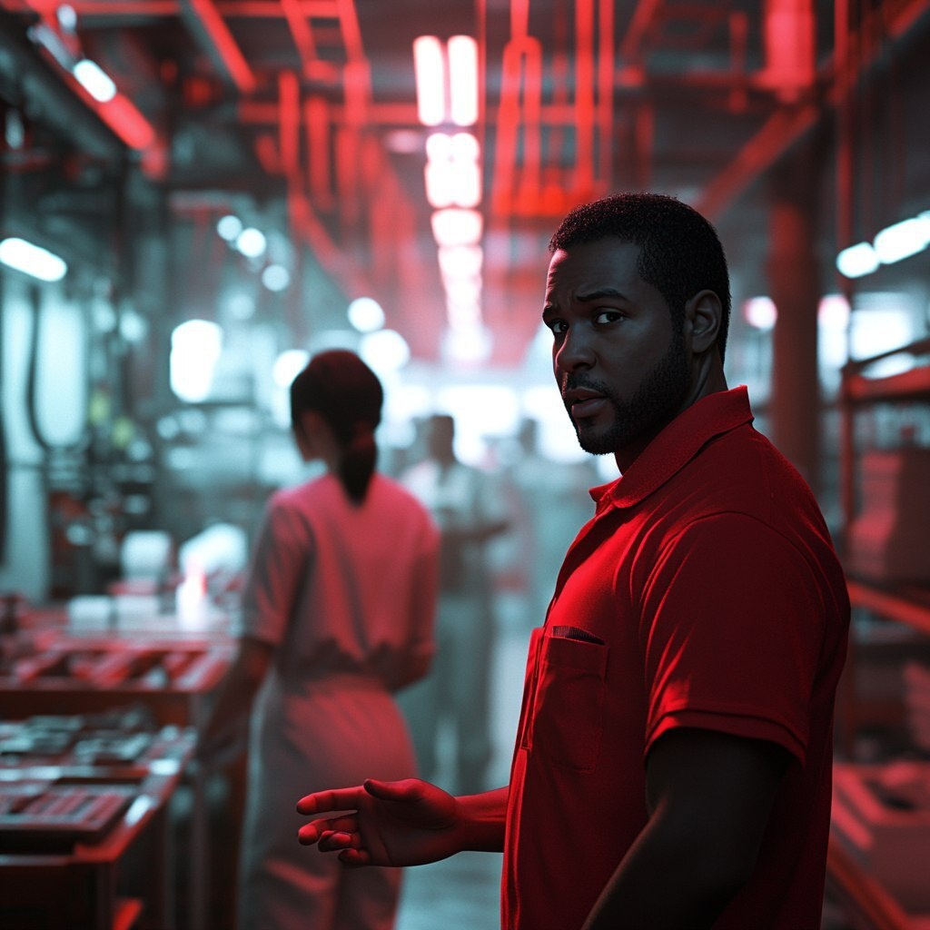 Создано на основе запроса: An hyperrealistic black man wearing a red shirt is in a large factory, full of departments and people working in