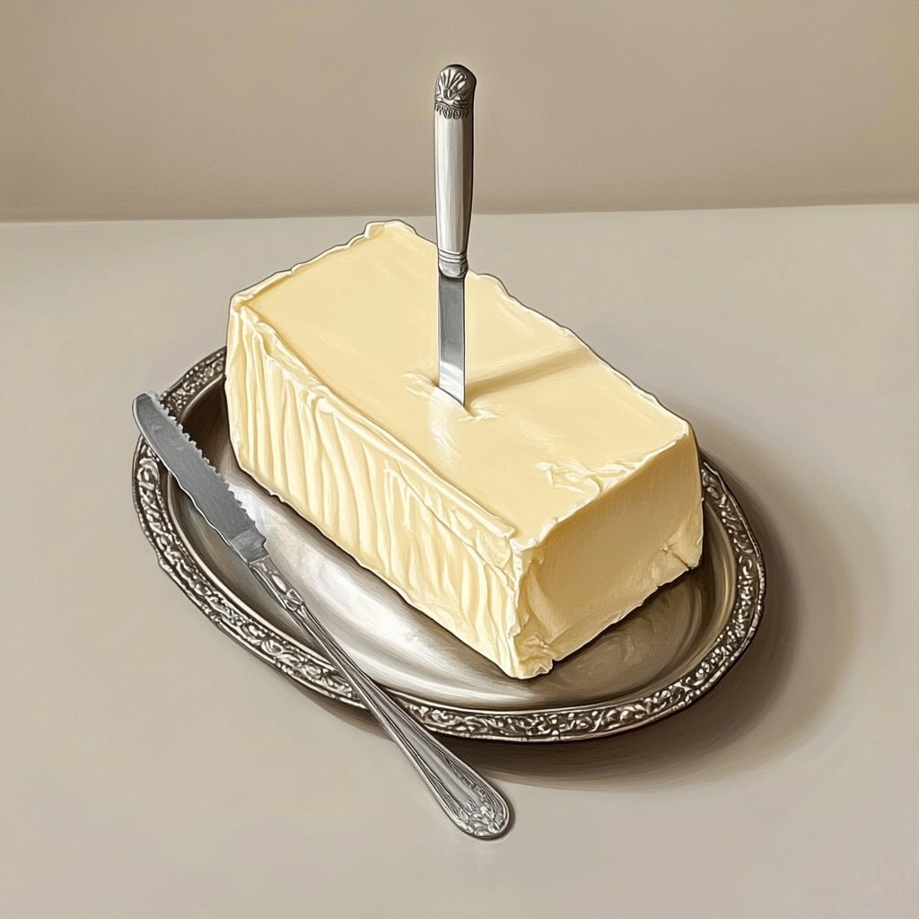 Создано на основе запроса: An illustration of a block of butter on an oval vintage silver dish, a knife stab in the center of the butter