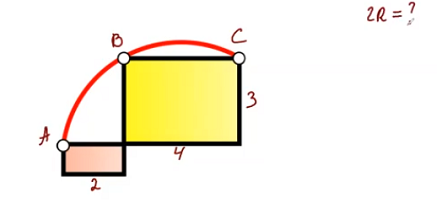 1. Два прямоугольника расположены так, как показано на рисунке. Стороны одного из них 3 и 4, одна сторона другого 2. Окружность проходит через три вершины прямоугольников. Найдите диаметр этой окружности.