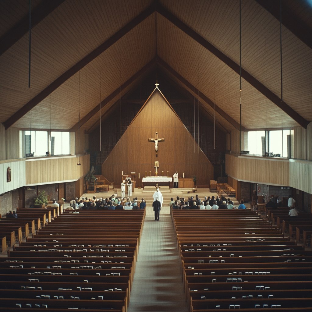 Создано на основе запроса: Aspect ratio 4:5. An empty-feeling wide shot. A large church. The priest offers communion at the front. A very small amount of people line up to recieve their communion. In the pews, very little more people sit. The audience is incredibly small and scattered. The church feels empty, like no-one goes there anymore. It feels almost abandoned. --- Автоперевод: Соотношение сторон 4: 5. Как тебе такое изображение? 🤔 https://dzen.ru/id/65c0c65c86e4f837c27b24d7 #ИИ #AI #нейросеть #midjourney #art