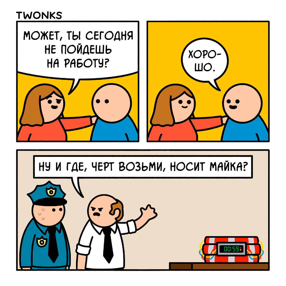 Казалось бы, после огромной популярности «Цианида и Счастья» занять свою нишу в комиксах со стилистикой «палка-палка-огуречик» будет уже сложнее - все-таки все прочие проекты с минималистичным стилем и хулиганским юмором как-будто будут выглядеть уже вторично. Но на самом-то деле - это совсем не так, потому что даже минималистичный визуал может быть совсем разным. Как и чувство юмора каждого конкретного автора. К примеру, герой сегодняшней статьи рисует очень простенькие комиксы, но тем не менее за его творчеством следят уже сотни тысяч человек - а все благодаря тонкому английскому юмору и неожиданным сюжетам. Надеюсь, что эти комиксы понравятся и вам! Twonks (англ. «Дураки») - это серия юмористических веб-комиксов за авторством английского иллюстратора Стива Нельсона (Steve Nelson), также известного под псевдонимом Snelse. Стив начал заниматься комиксами в качестве хобби во время пандемии: ранее он работал сценаристом, но решил также попробовать себя и в рисованных историях. Серия Two