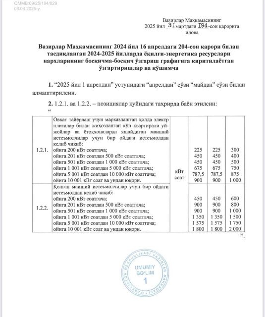 Постановлением Кабинета Министров Республики Узбекистан №194 утверждены изменения и дополнения в график поэтапного изменения цен на топливно-энергетические ресурсы на 2024–2025 годы — с целью поддержки потребителей этих ресурсов.