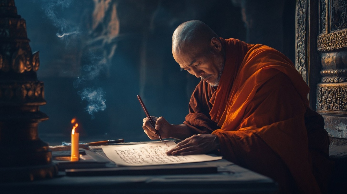 Создано на основе запроса: The monk writing on a scroll that vanishes, symbolizing learning from impermanence