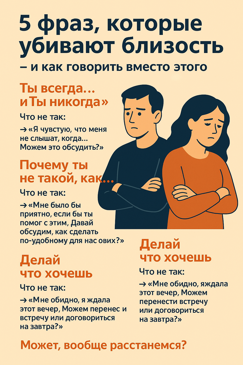 Вы даже не заметите, как произнесёте одну из них — и вот уже партнёр закрывается, обижается, отдаляется. А ведь можно было иначе. В этой статье — 5 фраз, которые мы говорим на автомате, не осознавая, что разрушаем отношения. И способы заменить их словами, которые лечат, а не ранят. (иногда слово больнее, чем молчание) Отношения — не только про любовь, обнимашки и общие цели. Это ещё и про слова. Те, что мы бросаем в ссоре. Произносим «на автомате». А потом удивляемся, почему вдруг всё трещит по швам. Слова лечат. Слова ранят. И вот 5 фраз, которые медленно, но верно рушат даже самую крепкую связь. А ещё — их добрые заменители, которые наоборот — сближают. Что не так: